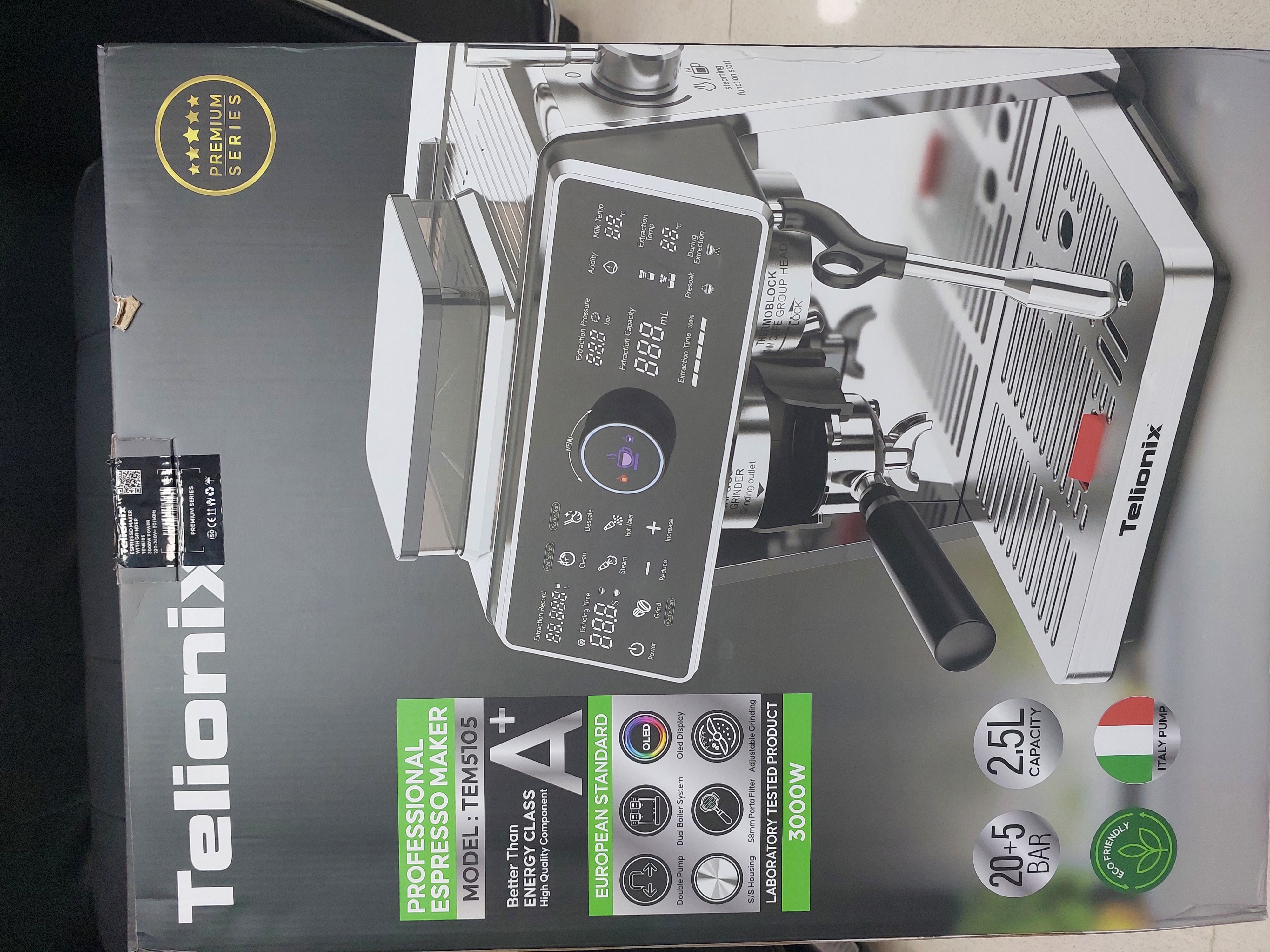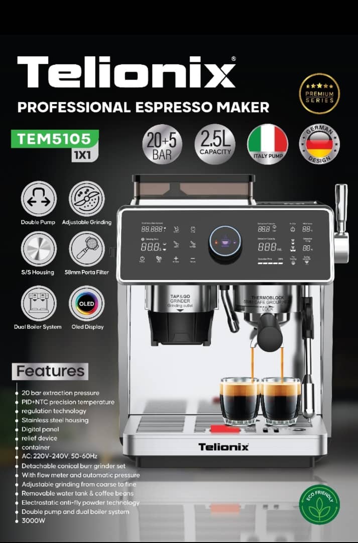 دستگاه اسپرسوساز نیمه صنعتی تلیونیکس مدل۵۱۰۵ .یک دستگاه نیمه صنعتی با کیفیت فوق العاده بالا و فول آپشن میباشد. صفحه لمسی-آسیاب سرخود-پیچر-پورتافیلتر صنعتی-تمپر